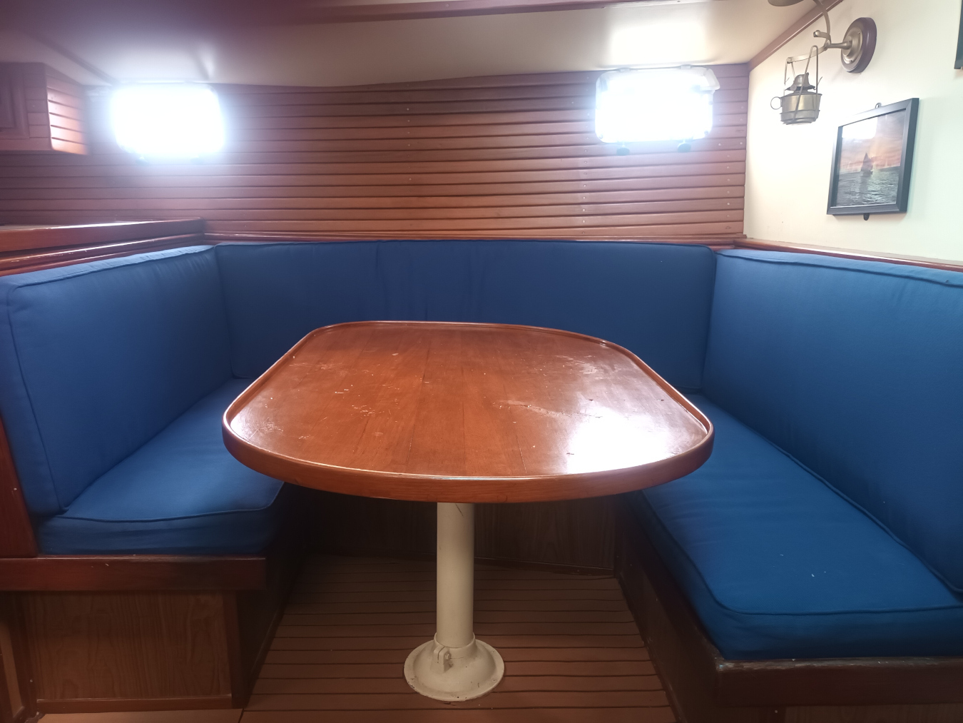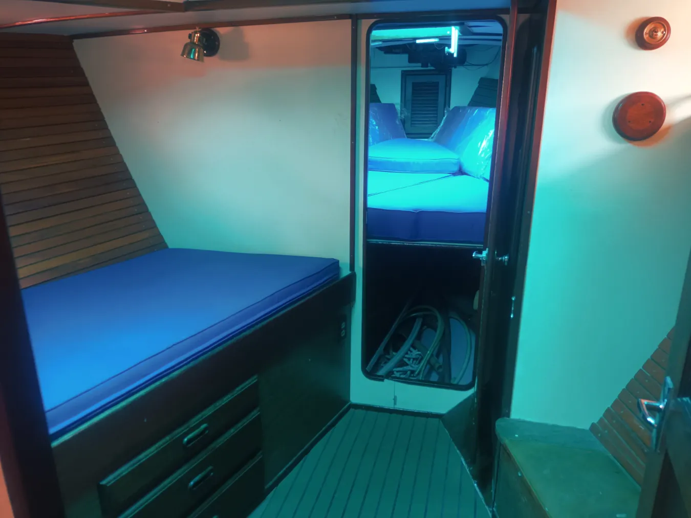 The Master Berth features a double bed and cosy seating, with skylight screening for privacy. The forepeak Berth is also desgined for two with similar skylight screening. While the Midship Berth, forward of the saloon, is designed for one. The saloon seating can offer at least two extra berths so you could sleep up to seven while at anchor or moored. There are two toilets / washrooms with shower and H&C water is available.